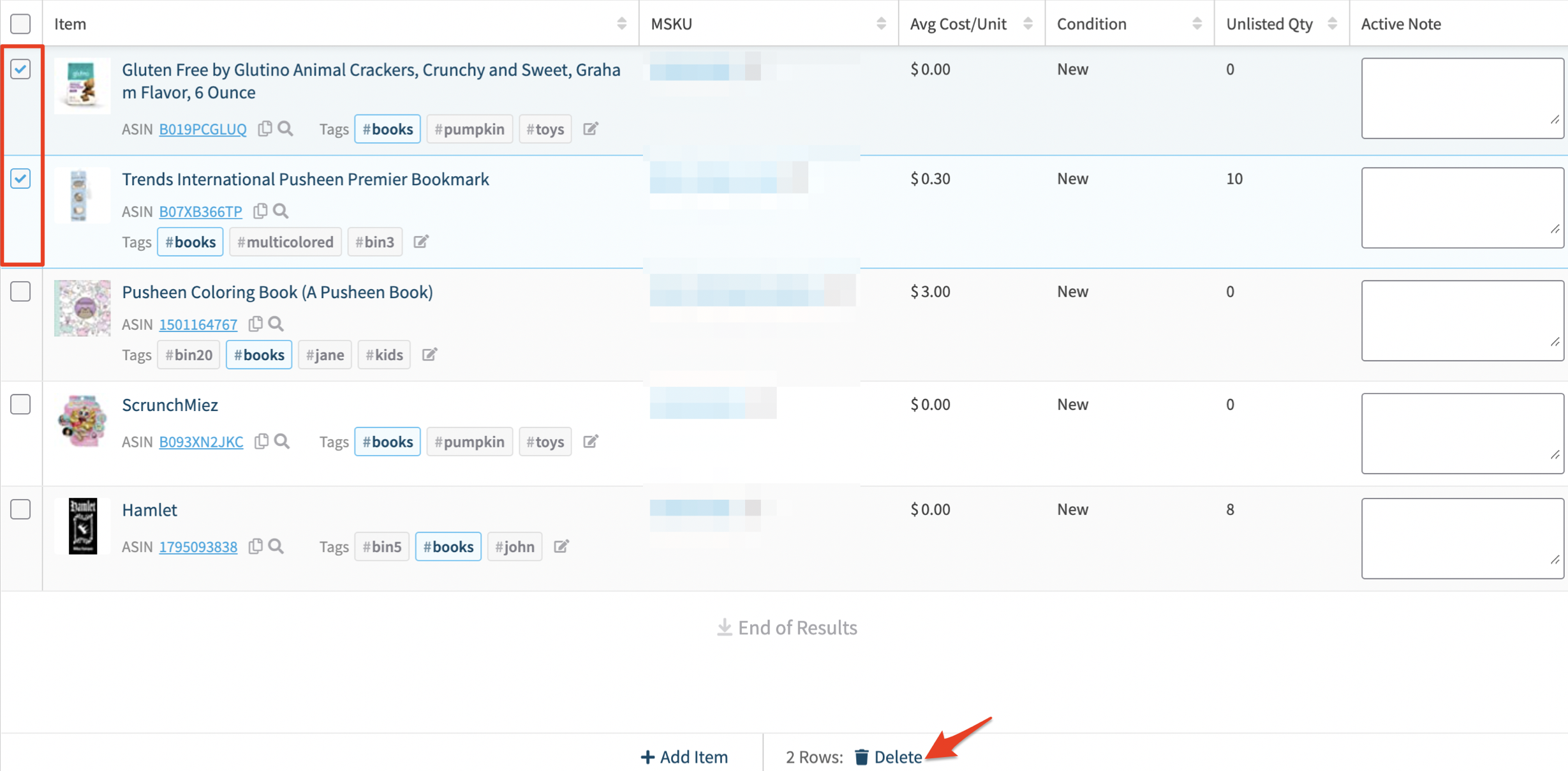 To delete Items from the Unlisted Inventory page, click the checkbox to the left of the item(s) you wish to delete to select them.